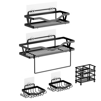 Organizador de almacenamiento de baño autoadhesivo sin perforación, paquete de 5 Caddy de ducha negro a prueba de herrumbre con soporte para maquinilla de afeitar